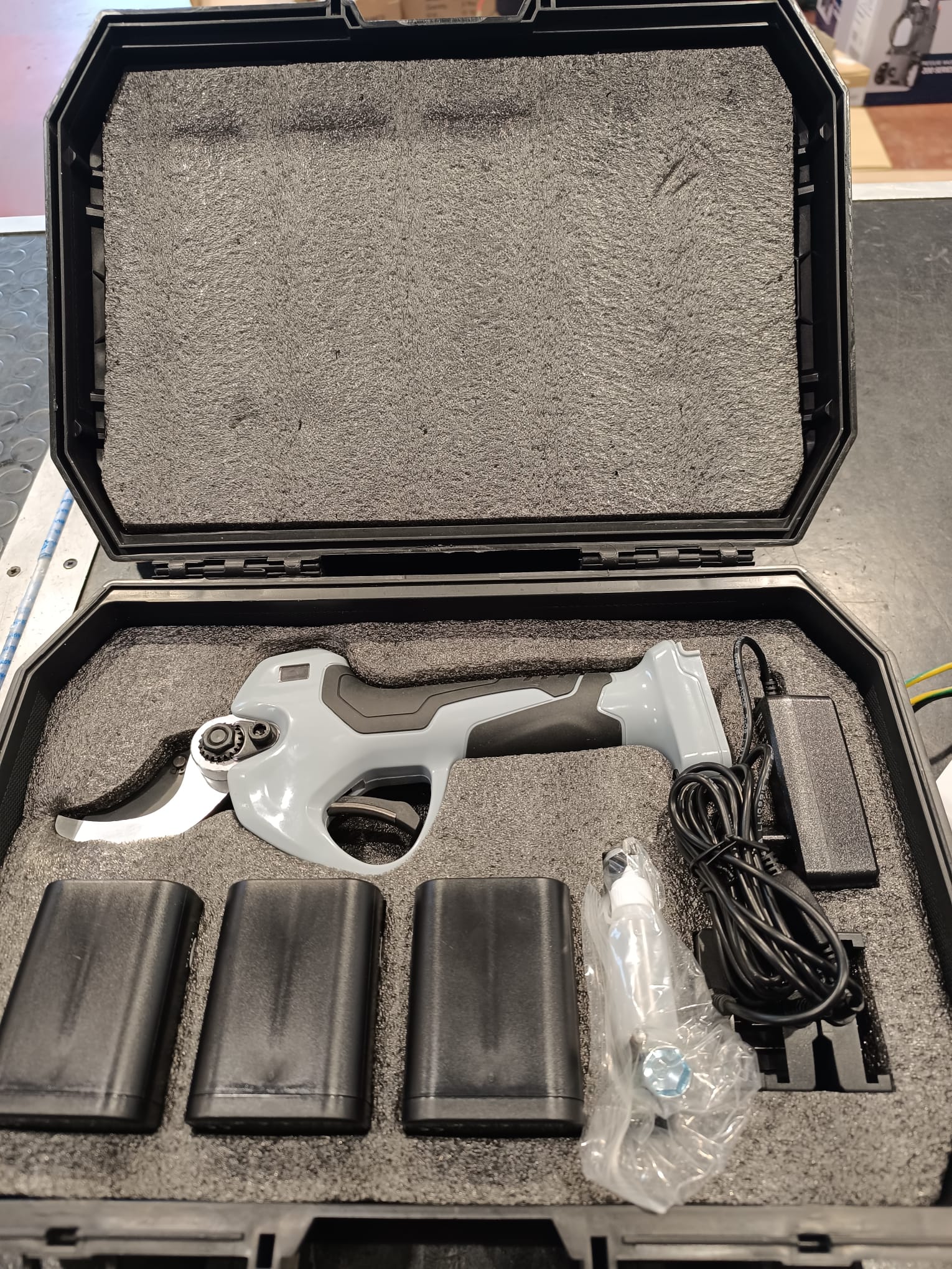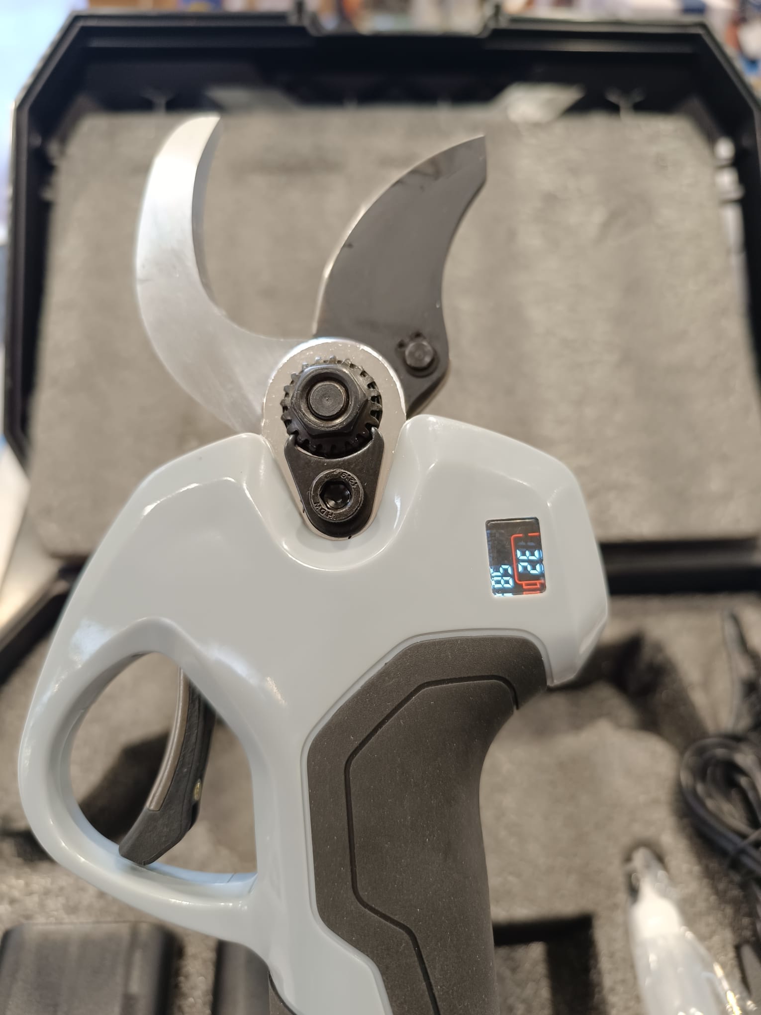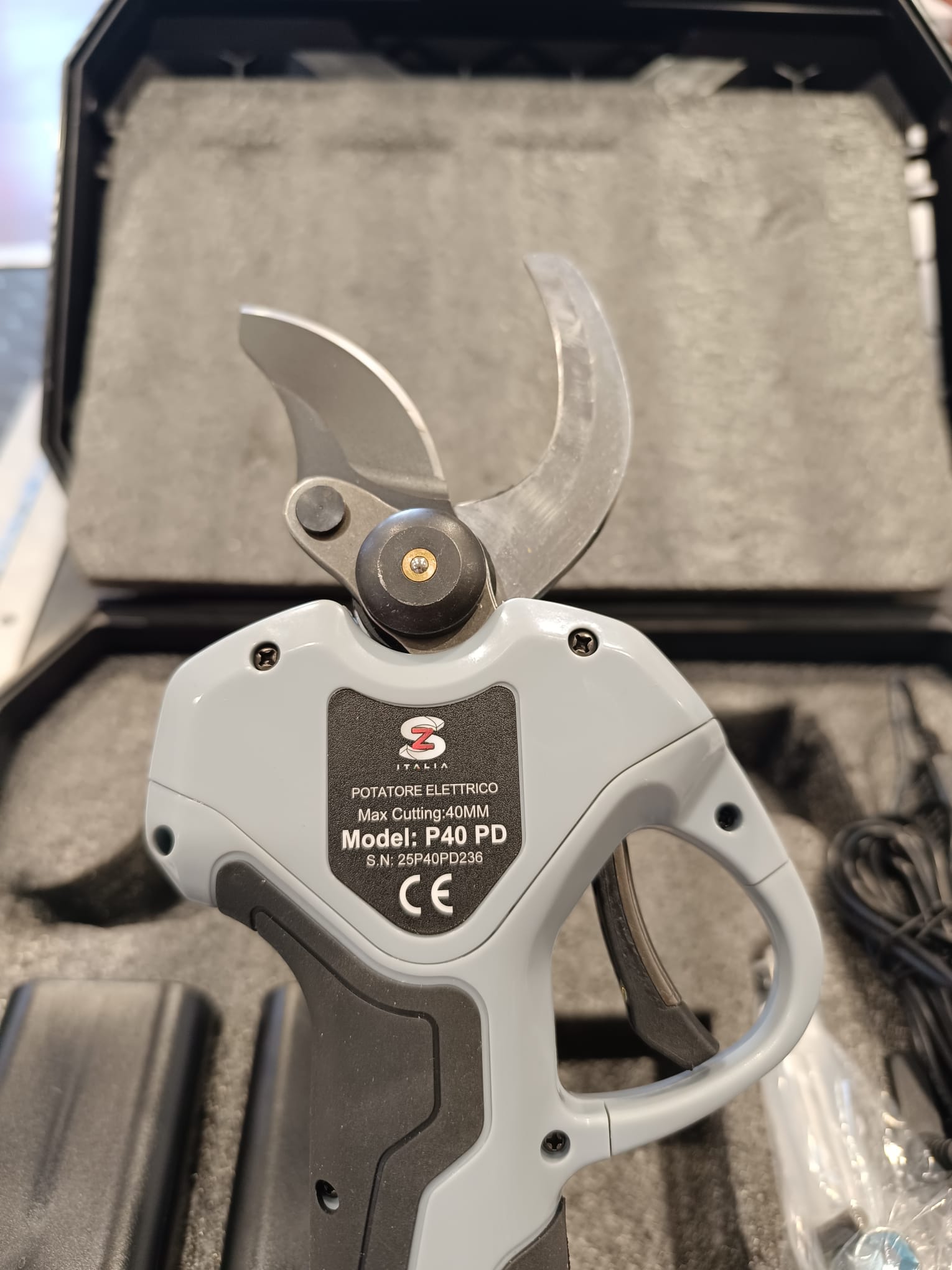 Forbice professionale con batteria integrata; capacità di taglio progressivo a due ampiezze fino a 40 mm. Lame in acciaio svizzero SK5. Batteria con voltaggio 21 V e capacità di 2.6 Ah. Tempo di ricarica di 3h ed autonomia fino a 3-4h. In dotazione valigetta contenente la forbice, 3 batteria da 2.6 Ah, il caricabatterie ed il set di manutenzione.